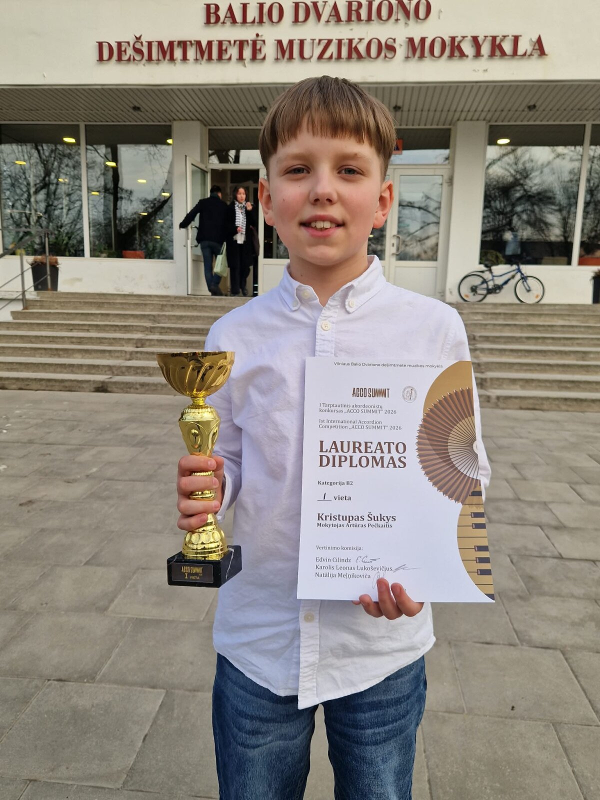 Ką tik grįžęs iš 6-ojo Nacionalinio akordeonistų konkurso Pasvalyje ir įvertintas A-2 kategorijoje III vieta, Kristupas Šukys (mokytojas Artūras Pečkaitis) jau kitoje B2 (varjete) kategorijoje kovo 30 d. grojo Vilniaus Balio Dvariono dešimtmetės muzikos mokyklos organizuotame I tarptautiniame akordeonistų konkurse "ACCO SUMMIT - 2026", kuriame dalyvavo akordeonistai iš Latvijos, Estijos, Lenkijos ir Lietuvos. Šį kartą Kristupą lydėjo sėkmė - jis tapo I vietos laimėtoju. Sveikiname :)