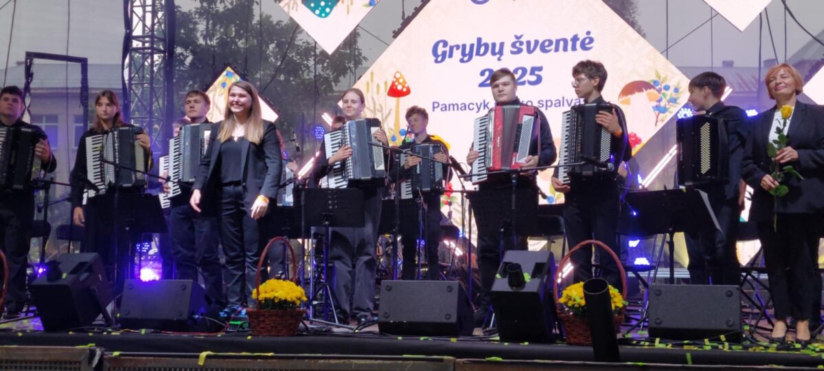 Šių metų šventės tema "Pamacyk miško spalvas" ragino iš naujo atrasti Dzūkijos peizažų grožį, pajusti gamtos ritmą ir, be abejo, paminėti M. K. Čiurlionio 150-ąsias gimimo metines. Džiaugiamės, kad buvome pakviesti į šią įspūdingą šventę. Jungtinis Varėnos J. Čiurlionytės menų mokyklos (mokytoja Renata Bakulienė),Vilkaviškio menų mokyklos (mokytoja Liucija Bindokienė), Kybartų skyriaus (mokytoja Jūratė Stankevičienė) akordeonistų orkestras nuotaikingomis melodijomis džiugino grybautojus ir šventės svečius. Gera buvo po vasaros atostogų muzikuoti drauge. Jei grybų sezonas jau baigiasi, tai akordeonistai šių metų koncertinę veiklą tik pradeda.