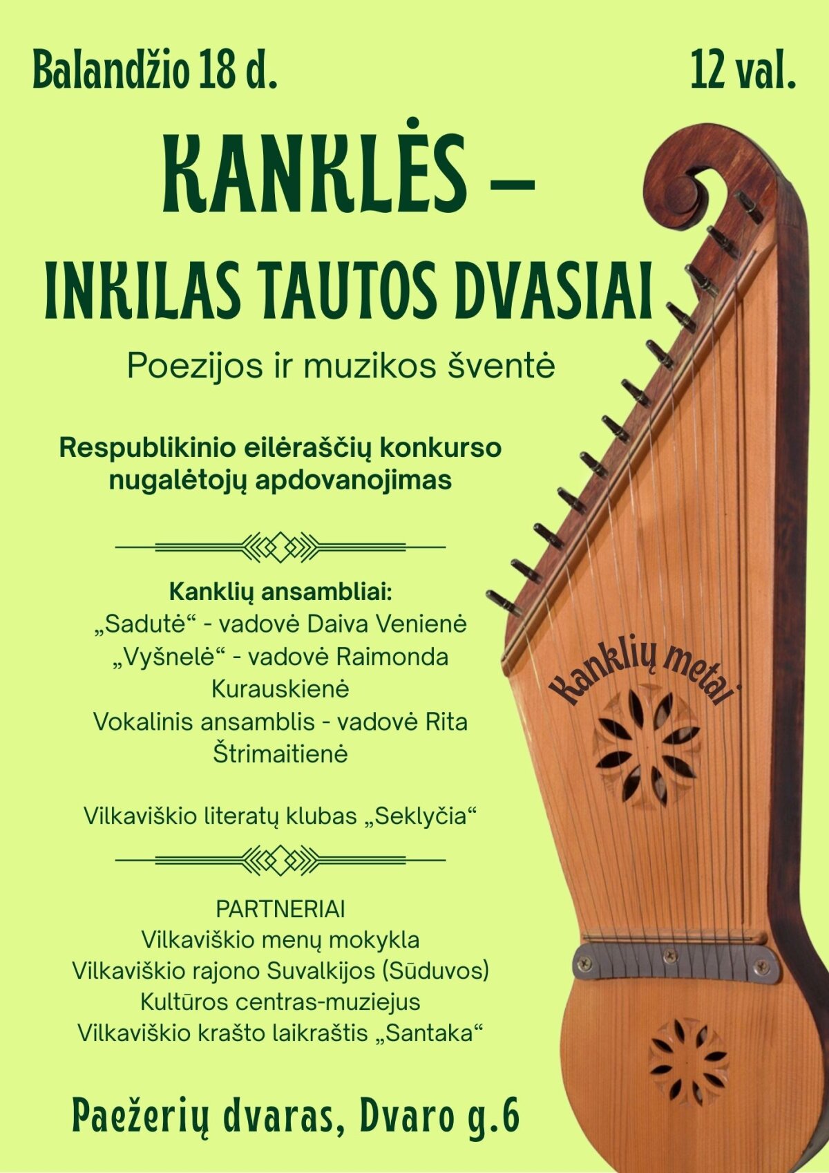 Vyko respublikinis eilėraščių konkursas „Kanklės – inkilas tautos dvasiai“. Šią gražią šventę dovanojo Vilkaviškio literatų klubas „Seklyčia“ ir Vilkaviškio menų mokykla. Muzika ir žodis į vieną bendrą, šiltą bendrystės ratą tądien sujungė visus – atlikėjus, kūrėjus ir klausytojus.